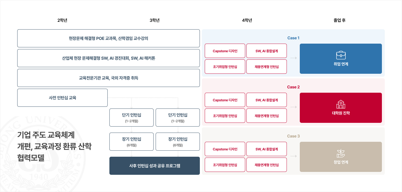 이를 위해 국내 최대 규모의 인공지능융합대학을 신설하여 SW 전공 및 융합 교육을 혁신하고, 전 학과에 AI 마이크로디그리를 도입했습니다.