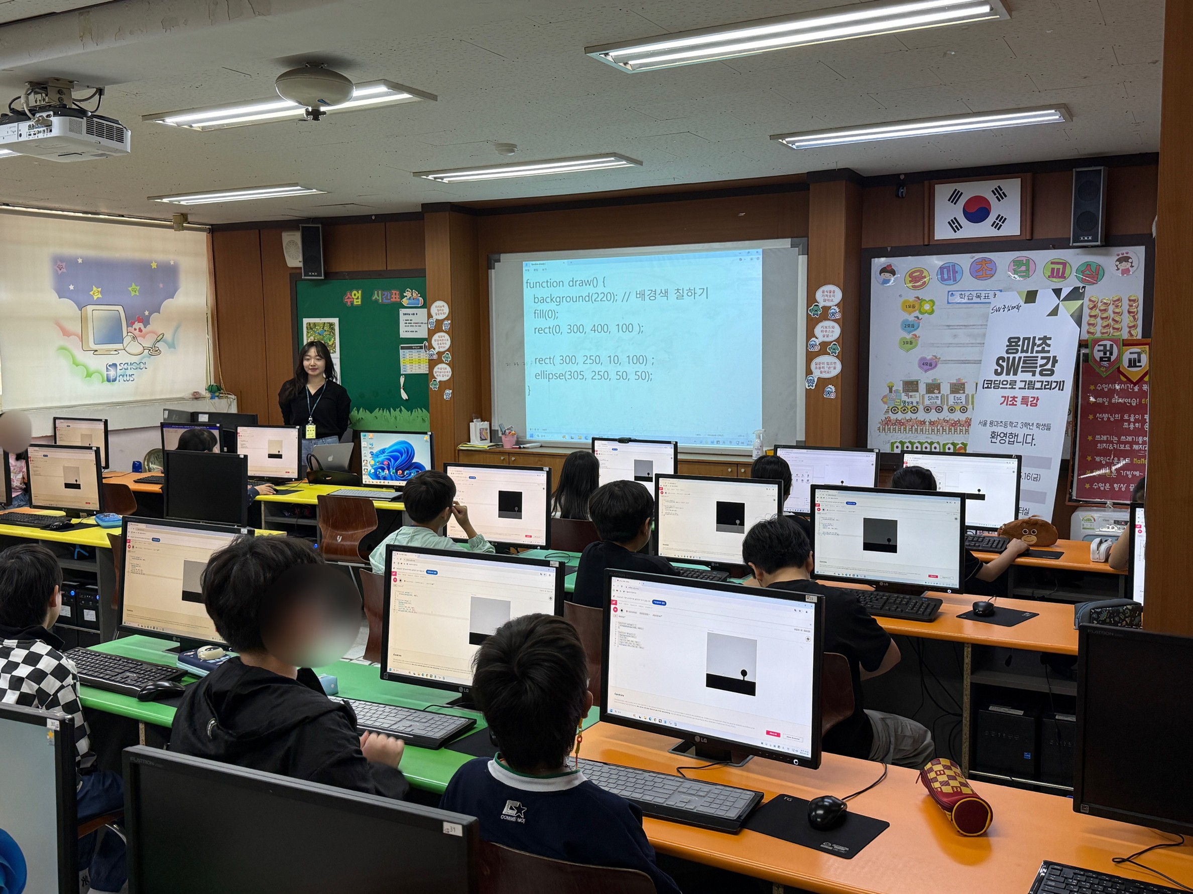 초등학교에 방문히여 정보수업시간에 세종대학교 SW중심대학사업단 소속 교수님과 학부생들이 개발한 교육 프로그램을 실습하는 프로그램 입니다.